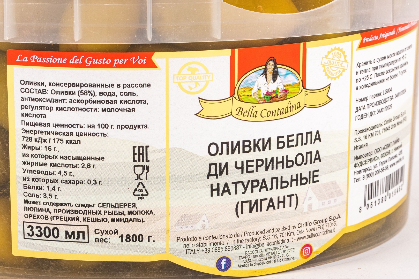 Оливки Белла Ди Чериньола Гигант с Косточкой Bella Contadina 3300мл Сух. Вес 1800г