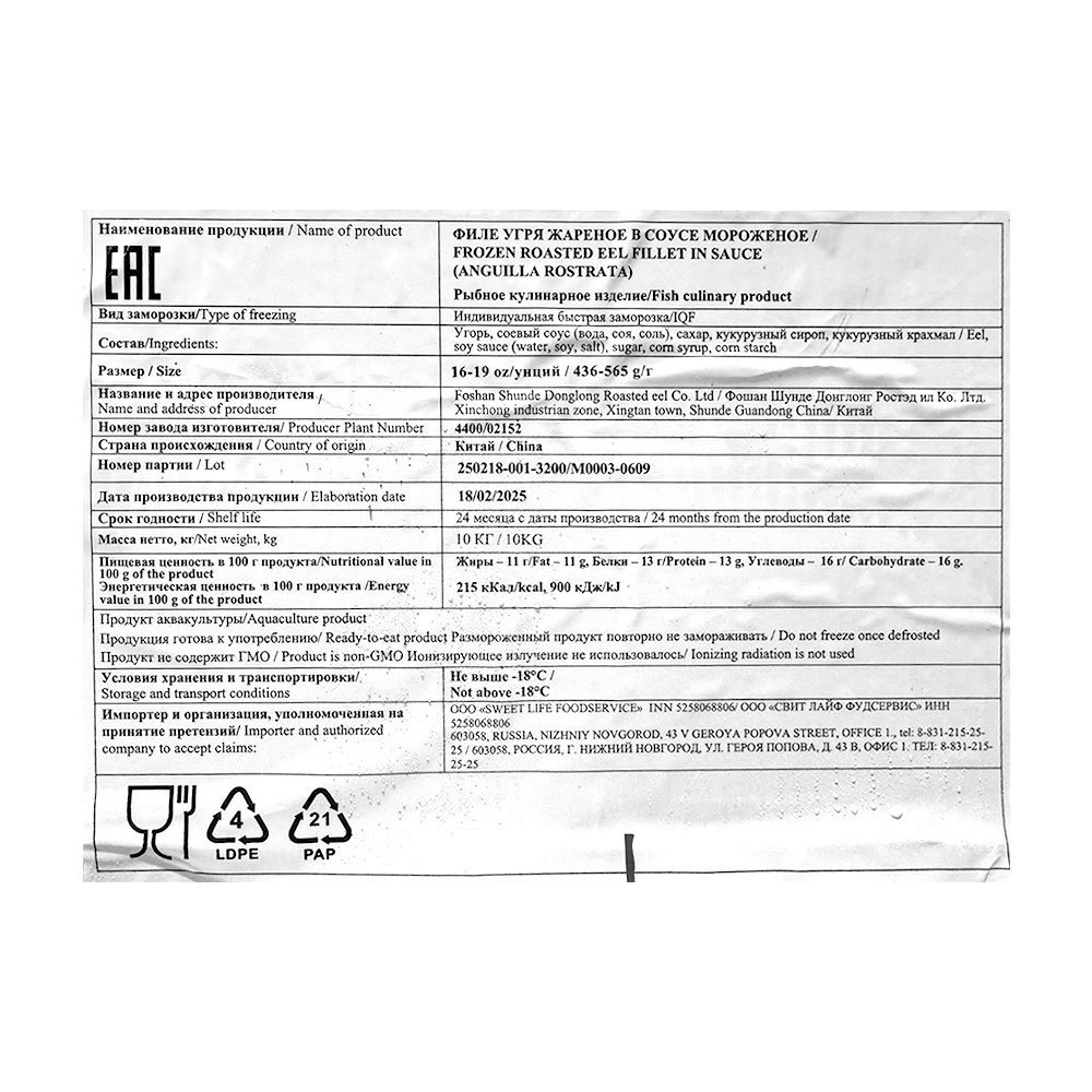 Угорь Жареный Замороженный Foshan Shunde Donglong 16-19 Унций 435-565г 5кг