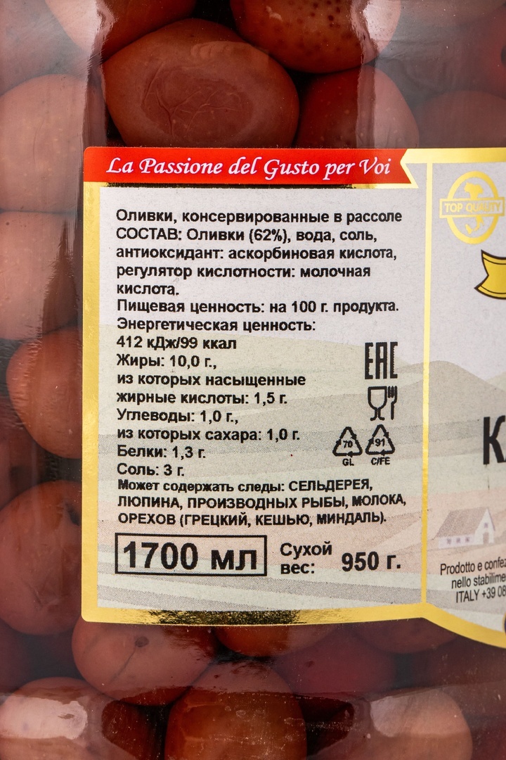 Оливки Каламата Bella Contadina с Косточкой 1,7л Сух. Вес 950г