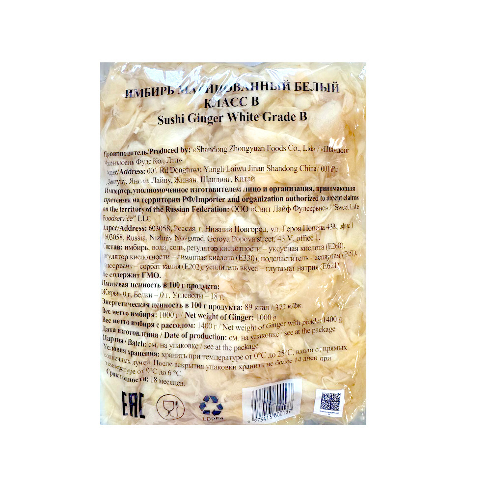 Маринованный белый имбирь класса В — это универсальный ингредиент для приготовления различных блюд. Он придаст пикантный вкус и аромат, станет украшением стола и полезным дополнением к суши, роллам, мясу и рыбе.