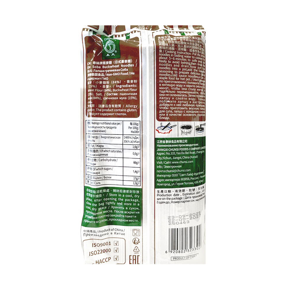 Лапша соба от Chunsi — отличный выбор для ценителей азиатской кухни. Эта лапша изготовлена из гречневой муки и подходит для приготовления различных блюд. Она идеальна для супов, салатов и горячих блюд. Лапша соба придаст вашим кулинарным шедеврам неповторимый вкус и аромат. Попробуйте и насладитесь аутентичной азиатской кухней!