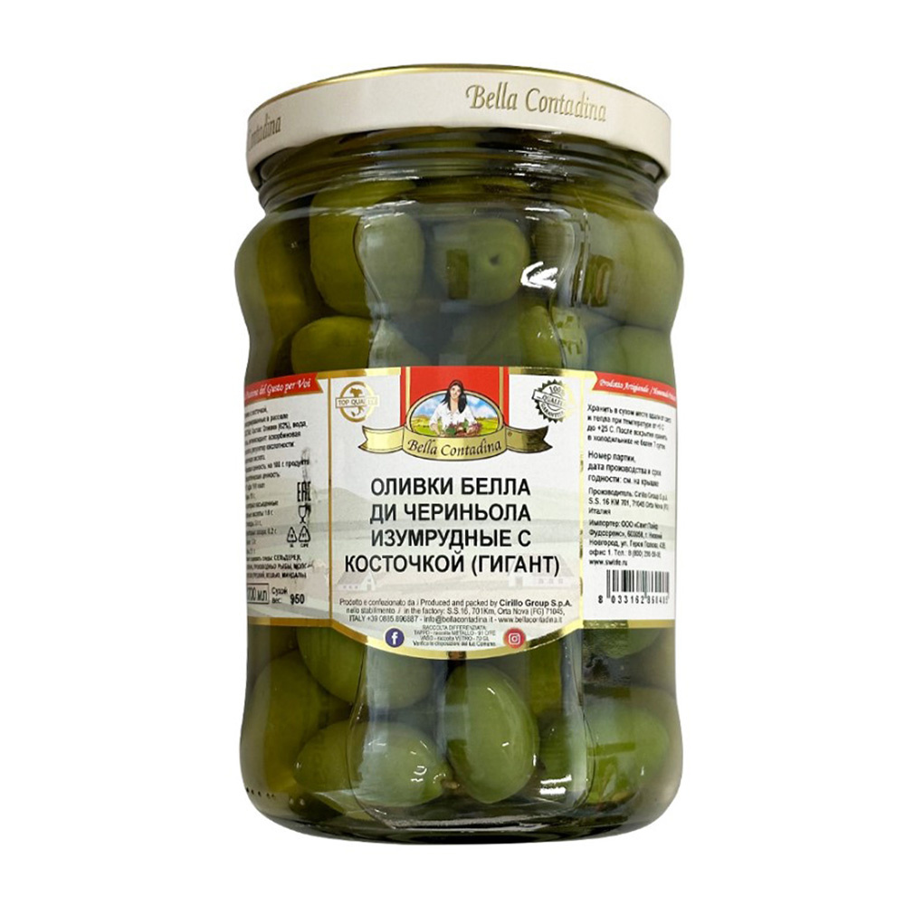 Оливки Белла Ди Чериньола Изумрудные с Косточкой 1,7л Сухой Вес 950г