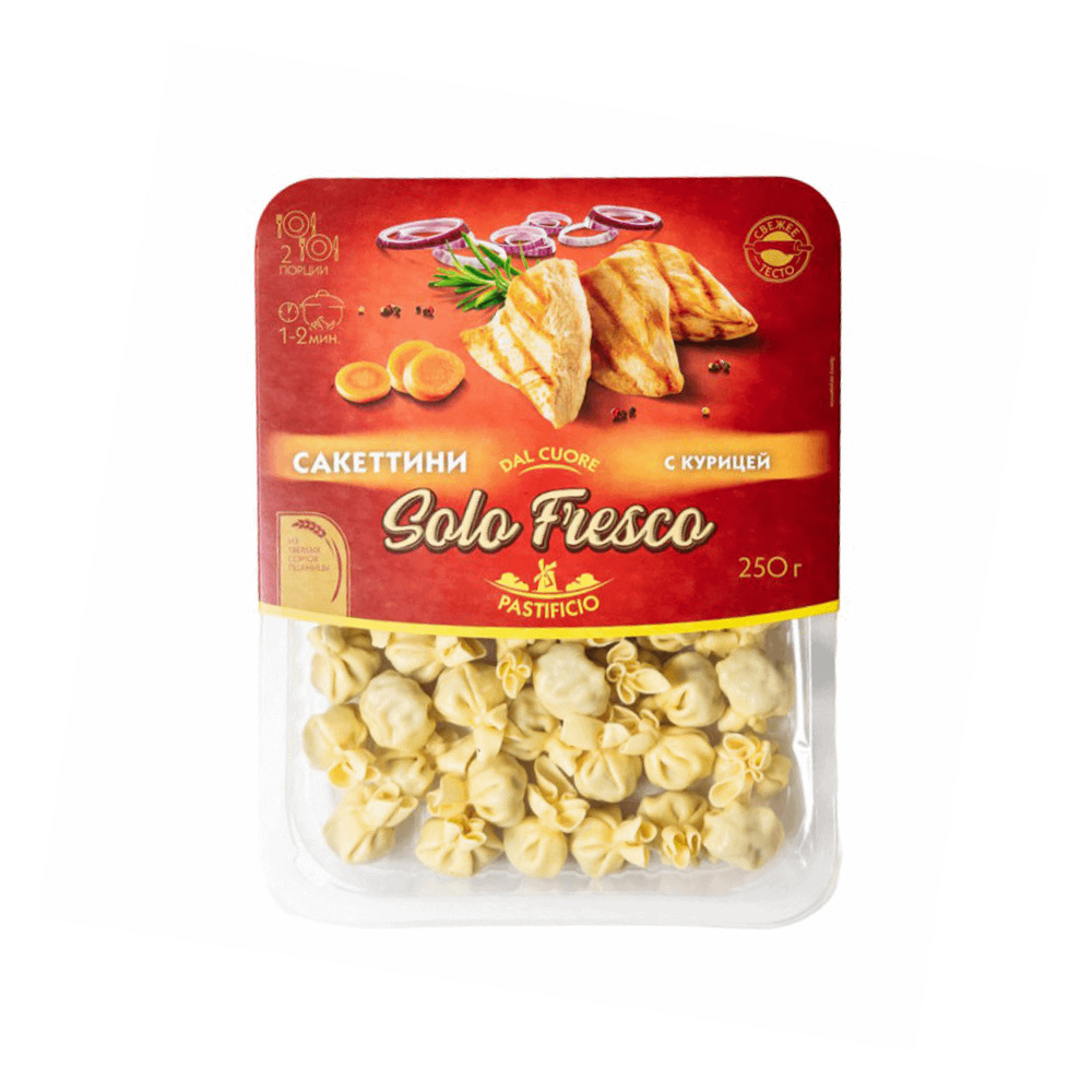 Сакеттини буквально означает «маленькие мешочки», представляет собой разновидность итальянской пасты с начинкой. Нежнейшие сакеттини от Solo Fresco состоят из яичной пасты с нежной начинкой из куриной грудки и сыра моцарелла. Идеально с томатным или сливочным соусом. Отличный способ быстро и вкусно приготовить ужин для всех близких. Насладитесь итальянским блюдом прямо у себя дома, вместе с Solo Fresco.