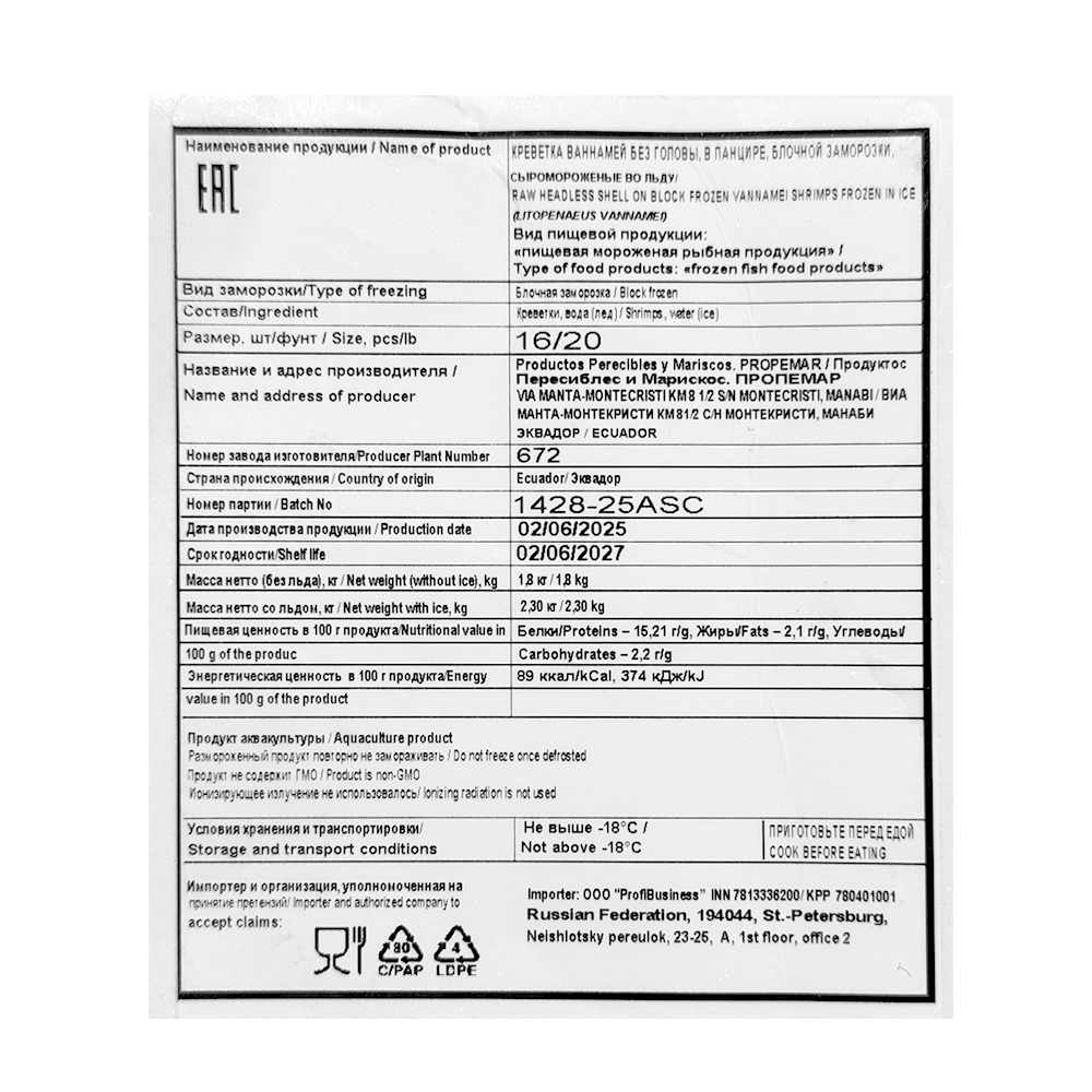 Креветки Smart Chef без Головы в Панцире с/м Propemar Эквадор 16/20 до 80шт 1,8кг