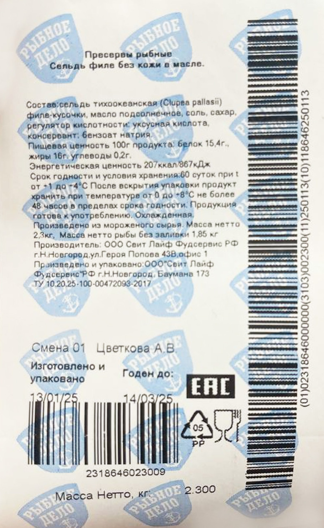 Филе тихоокеанской сельди обладает в меру соленым вкусом и плотной текстурой. Мясо не слишком мягкое, держит форму, не имеет мелких костей. Кусочки филе прекрасно добавить в винегрет, подать к жареному картофелю или просто насладиться с долькой лимона и свежей зеленью. Масса нетто рыбы без заливки: 1,85кг