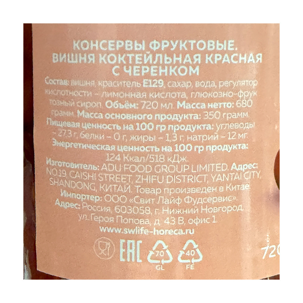 Вишня Коктейльная Smart Chef без Косточки с Черенком 720мл ст/б