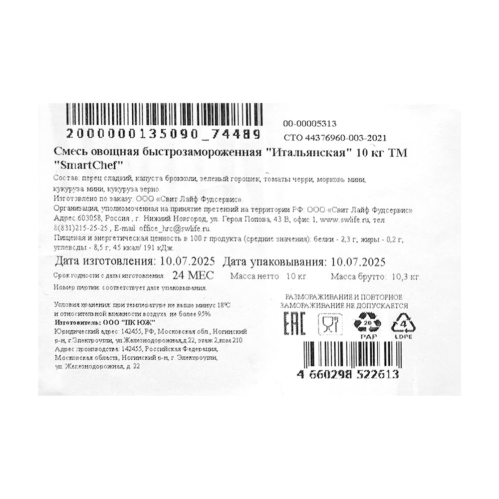 Смесь Овощная Smart Chef Итальянская Замороженная 10кг