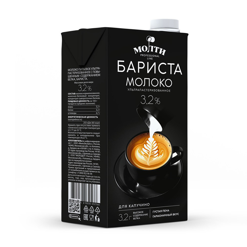 Ультрапастеризованное молоко Молти Бариста идеально подходит для создания эспрессо, капучино и латте. Оно также отлично впишется в рецепты каш и десертов, придавая им нежный вкус. Объём 1 литр — удобно для домашнего использования.