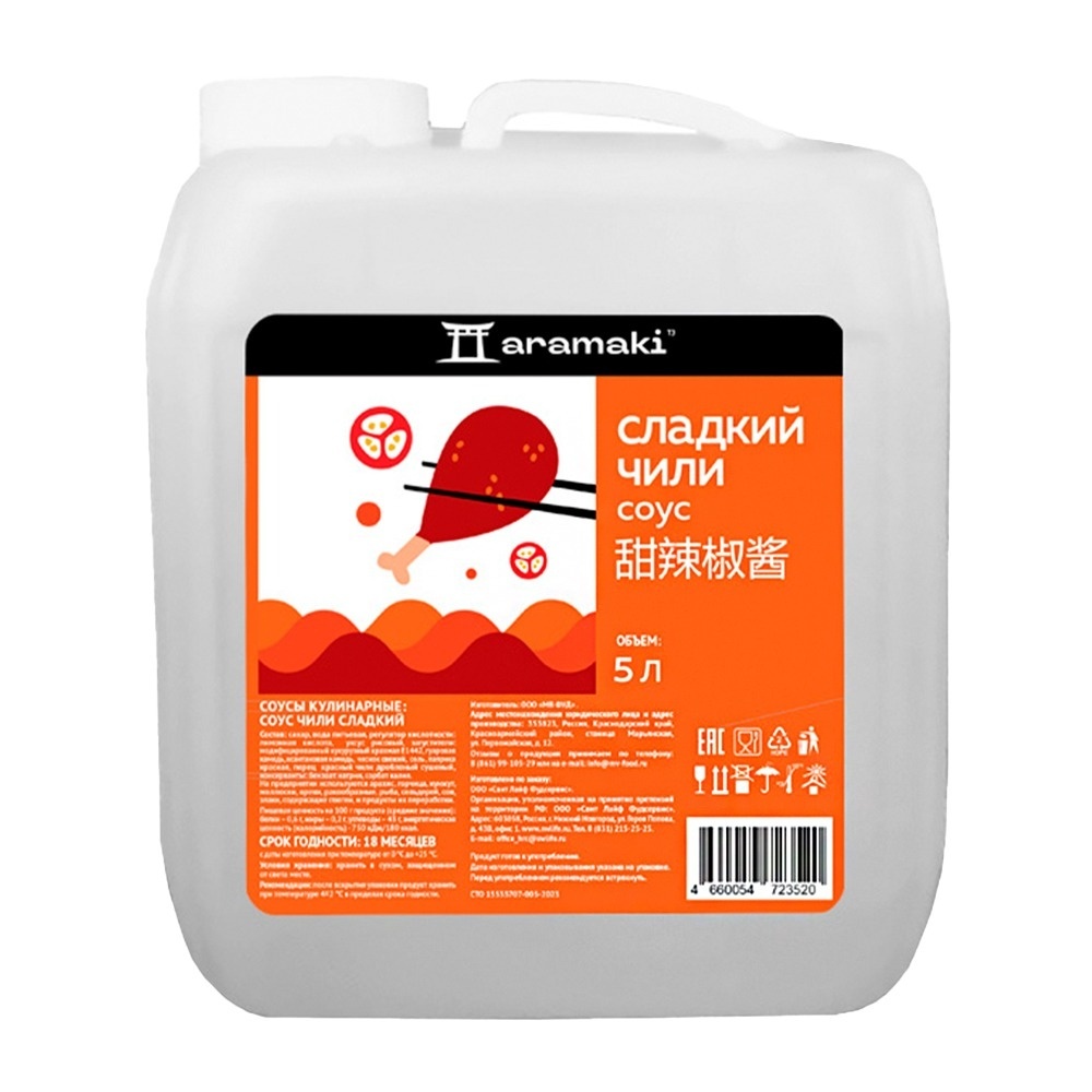 Соус Aramaki сладкий чили объёмом 5 литров — находка для любителей азиатской кухни. Придаст блюдам пикантный вкус и аромат. Идеально подходит для маринования мяса и овощей, а также как соус для готовых блюд. Отлично дополнит лапшу, рис, мясные и рыбные блюда.