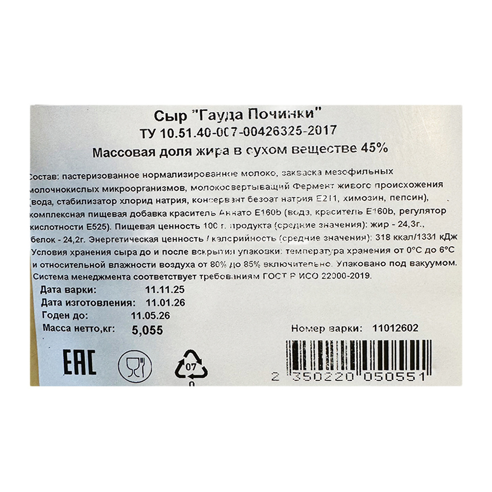 Полутвердый сыр Гауда Починки 45% — отличный выбор для любителей сыров. Этот сыр отличается насыщенным вкусом и ароматом. Подходит для приготовления различных блюд: сырных тарелок, салатов, пиццы. Также может использоваться как самостоятельная закуска.