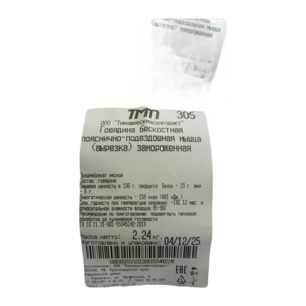 Вырезка Говяжья с Цепочкой Замороженная Тимошевскмясопродукт 2кг