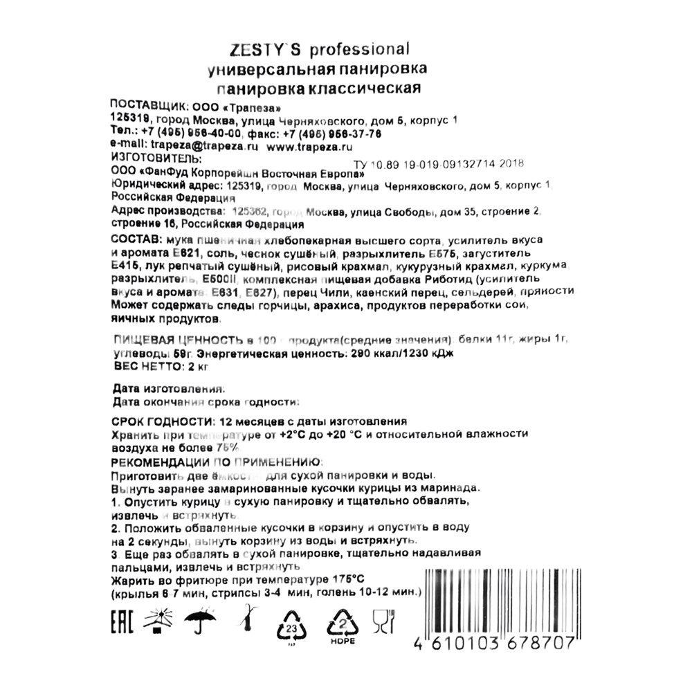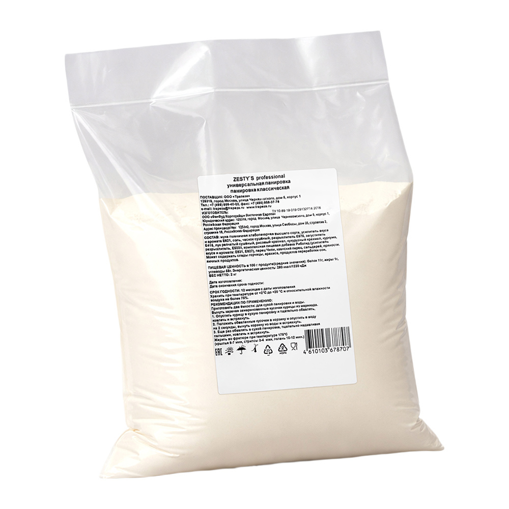 Универсальная классическая панировка Zestys Professional 2кг — идеальный выбор для приготовления вкусных и хрустящих блюд. Предназначена для обжаривания продуктов. Подходит для курицы, рыбы, овощей и других блюд. Легко использовать: просто обваляйте продукт в смеси и обжарьте.