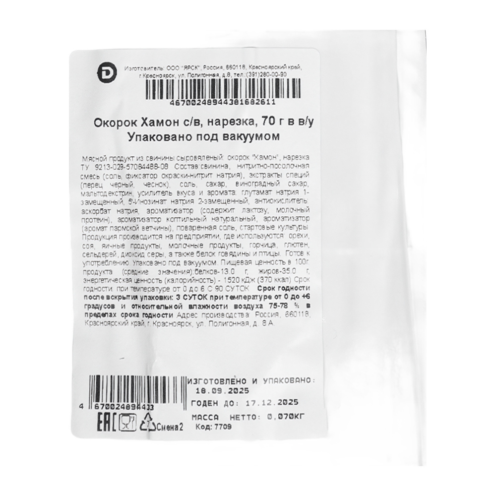 Хамон от Дымов — сыровяленый деликатес, который порадует своим насыщенным вкусом. Идеально подходит для создания закусок, добавления в салаты или использования как самостоятельного блюда. Отлично сочетается с сырами и легкими винами. Нарезка весом 70 г удобна для дегустации и небольших компаний.