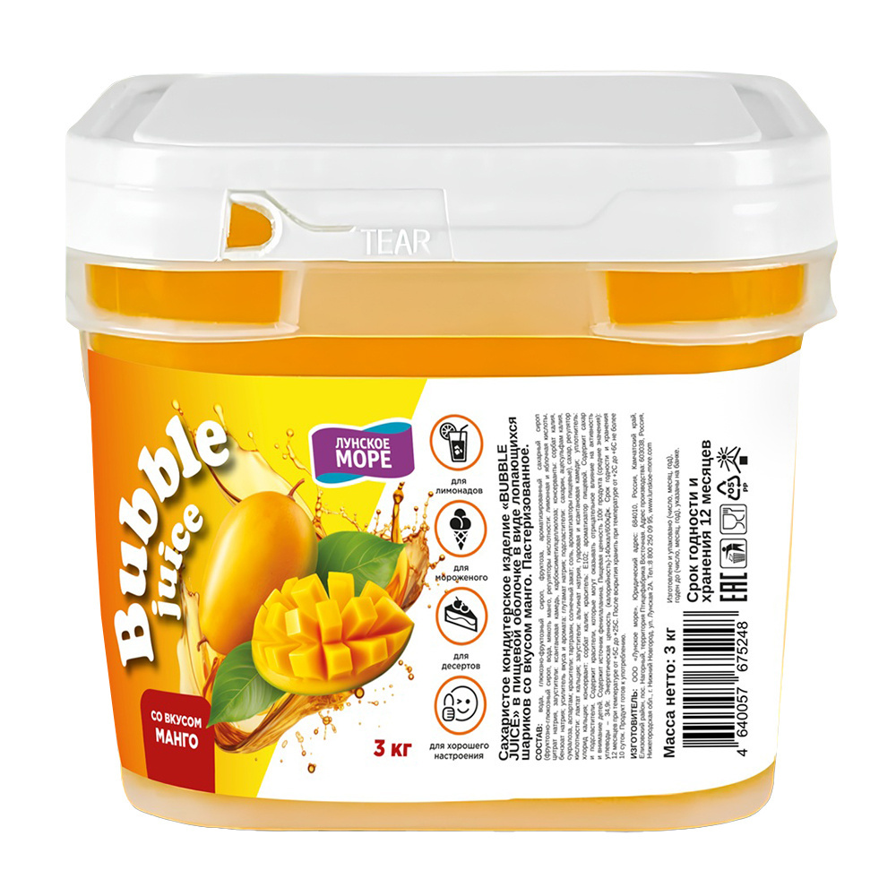 Джус Бабл Лунское Море со вкусом манго — это яркий и ароматный сухой компонент для украшения десертов и напитков. Придаст свежесть и экзотический вкус вашим кулинарным шедеврам. Идеально подходит для украшения тортов, пирожных, мороженого и коктейлей. Создаст атмосферу тропического острова на вашем столе.