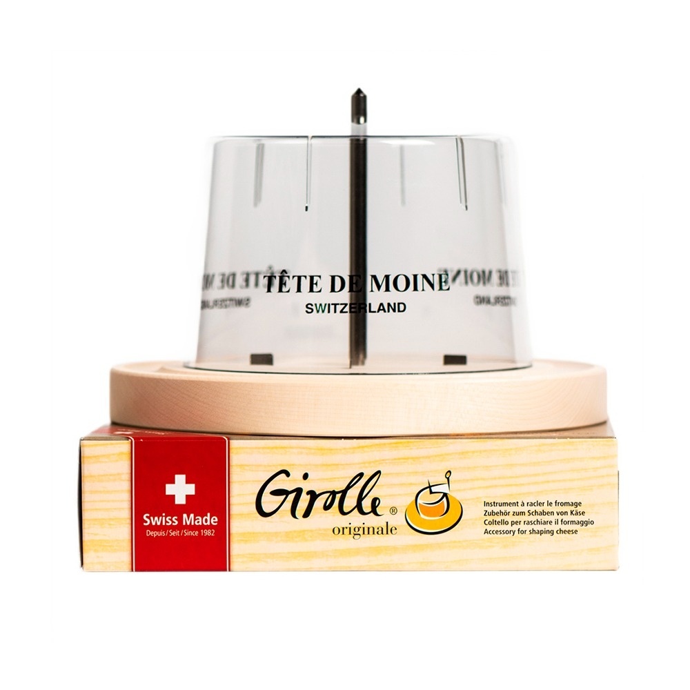 Швейцарский нож с колпаком для нарезки сыра Тет де Муан в виде розочек. Представляет собой металлический нож и подставку из 100% древесины клёна.Центральная ось и нож (собираемые вручную в мастерской в Lajoux) изготавливаются из нержавеющей стали, специально предназначенной для использования в кулинарии.