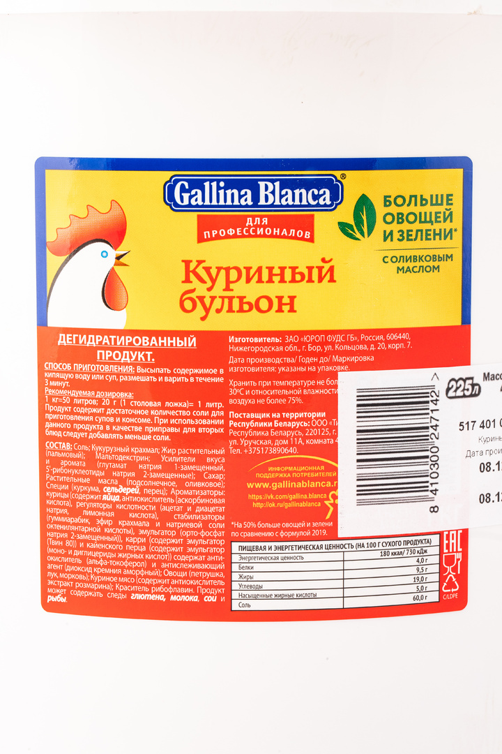 Бульон куриный "Gallina Blanca", дегидратированный, в фольгированном пакете по 1 кг. СТО 47531845-001-2015 Рекомендуемая дозировка: 1 кг=50 литров. Бульоны — это основа традиционной русской кухни. У поваров особые требования к бульону. Он должен быть золотистым, ароматным, наваристым и прозрачным. У повара-профессионала не всегда достаточно времени на приготовление куриного или мясного бульона. С бульонами Gallina Blanca для профессиональной кухни Вы получите потрясающий результат за самое короткое время.