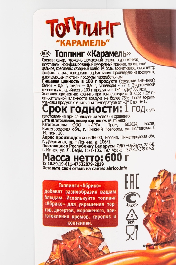 Топпинг Абрико карамель - идеальное сочетание сладкой карамели и ароматного абрикоса, подойдет для добавления в коктейли, молочные коктейли, мороженое, пироги и десерты. Отличается от аналогов превосходными органолептическими свойствами, густой консистенцией, удобной бутылкой оптимального объема с защитной мембраной и оригинальным силиконовым дозатором анти-капля в крышке. Высокое содержание натуральных ингредиентов гарантирует богатый натуральный вкус без неприятных синтетических оттенков.