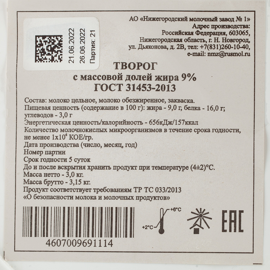 Творог 9% ведро Шахунья Россия ~ 3 кг