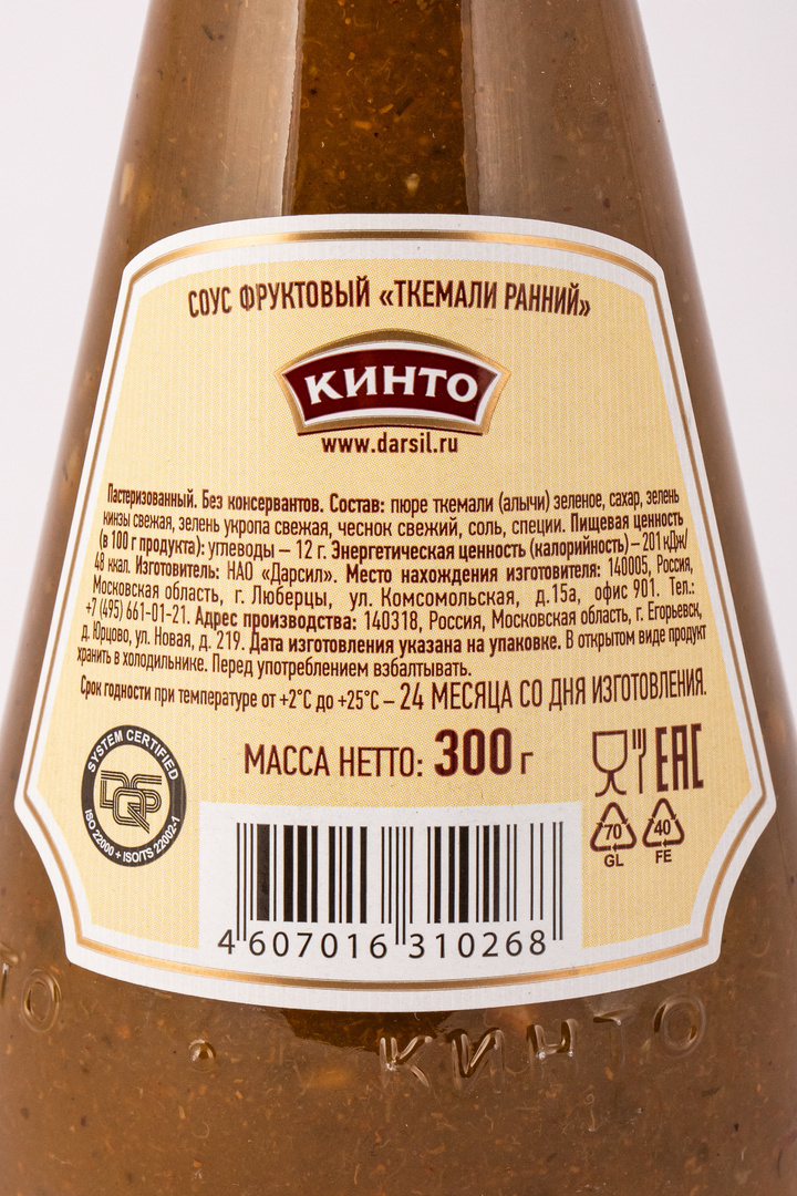 Соус фруктовый Кинто Ткемали Ранний делается на основе пюре из зеленой сливы с добавлением чеснока, свежей зелени укропа и кинзы, молотых семян кориандра. Его характерный кисло-сладкий вкус и аромат сделают любое блюдо истинно кавказским. Рекомендуется подавать с курицей (отварной или жареной), рыбой, мясом, молодым картофелем и печеными овощами. Благодаря своей освежающей кислинке делает жирную баранину и свинину легче и пикантнее. Продукт не содержит красителей, консервантов, ароматизаторов и других искусственных добавок.