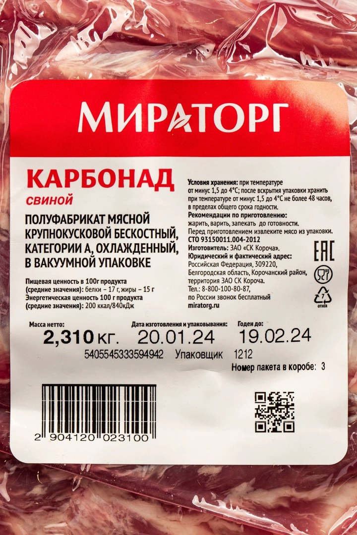 Карбонад Свиной Мираторг без Кости Охл 2,5кг