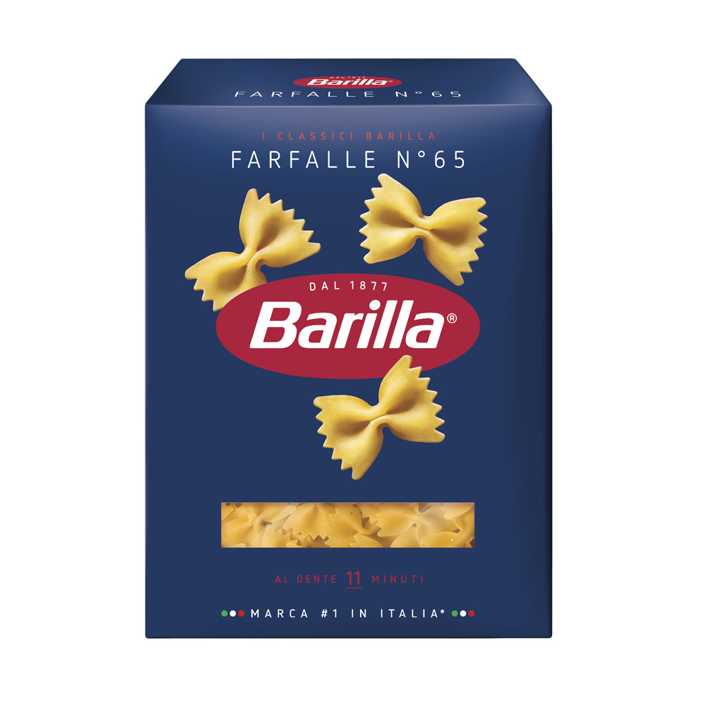Barilla Farfalle № 65 – восхитительная паста, форма которой так популярна в Италии. Главная отличительная особенность – необычный внешний вид, за который эти макароны ещё называют бабочками или бантиками. Чуть более плотная серединка и тонкие края – интересная структура для кулинарных экспериментов. Традиционно макароны-бабочки подают с рыбой, морепродуктами и лёгкими овощными или масляными соусами, однако они также отлично сочетаются с мясом, птицей и грибами. Barilla «Фарфалле» № 65 производятся из муки твёрдых сортов пшеницы высшего качества и воды. До состояния аль-денте они готовятся за 11 минут, не развариваются и не теряют форму.