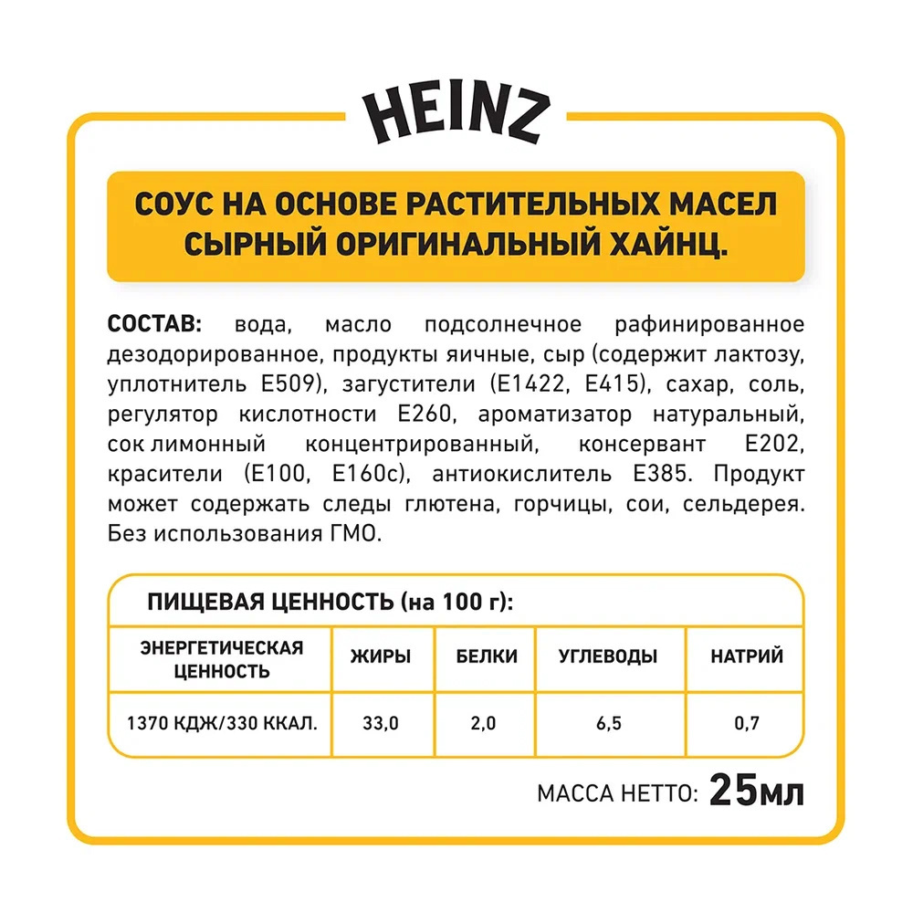 Порционный соус Heinz Сырный — отличное дополнение к вашим блюдам. Придаст пикантный вкус и насыщенный аромат. Подходит для горячих закусок, пасты, картофеля фри и других блюд. Удобная упаковка 25мл позволяет брать соус с собой и использовать в любых ситуациях.