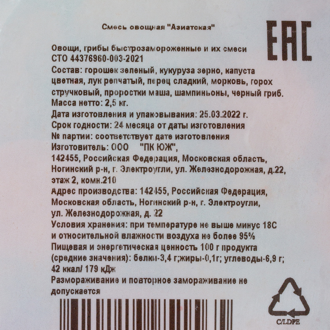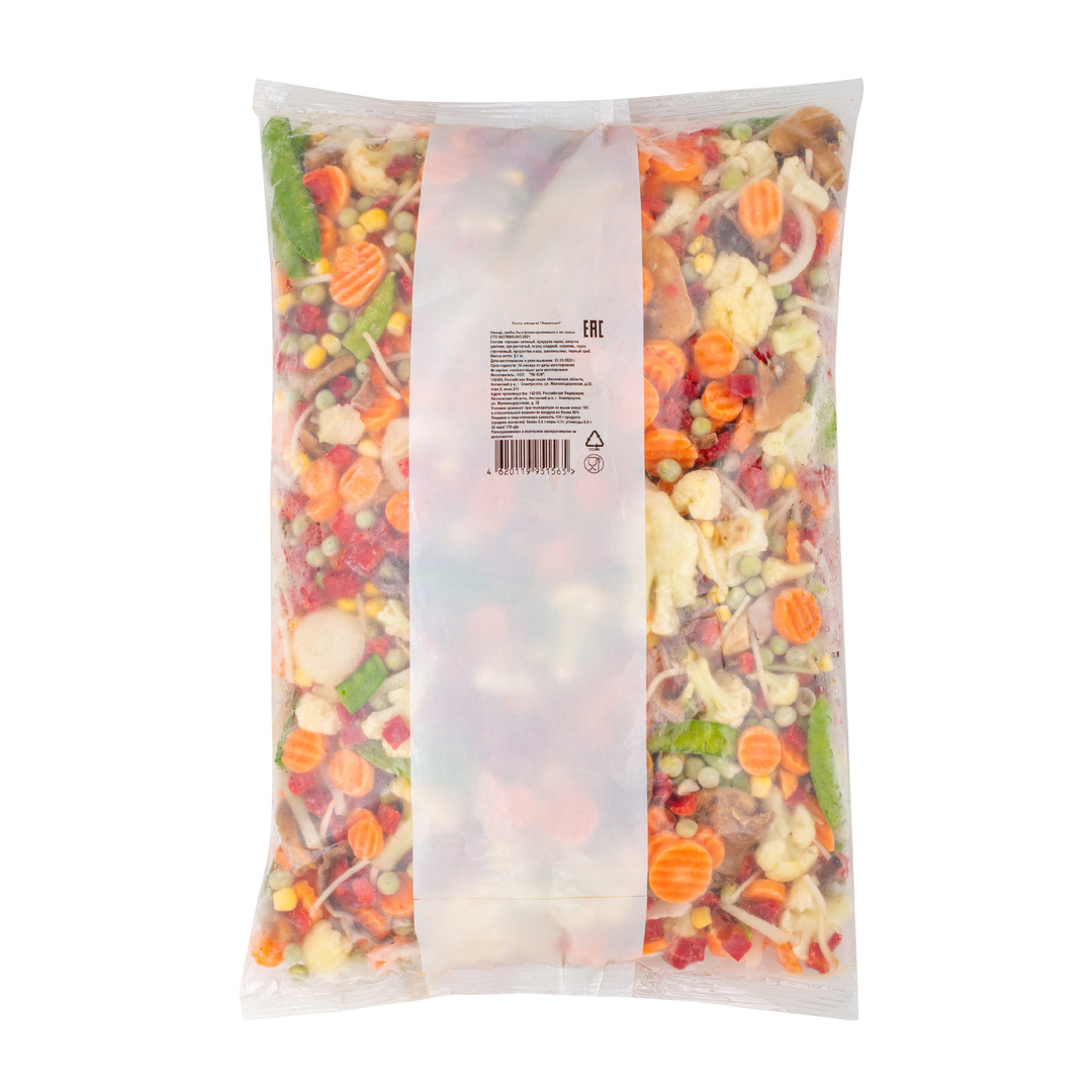 Состав: Цветная капуста, морковь, перец сладкий красный, шампиньоны, горошек зеленый, черный китайский гриб.