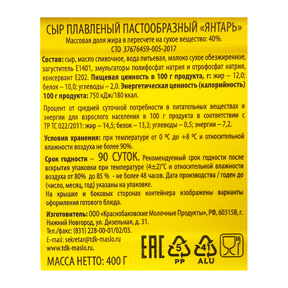 Плавленый сыр Главплавсыр Янтарь 40% — отличный выбор для любителей нежных и ароматных сыров. Этот сыр прекрасно подходит для приготовления бутербродов, добавления в соусы и плавления в горячих блюдах. Идеален для сытных завтраков или быстрых перекусов.