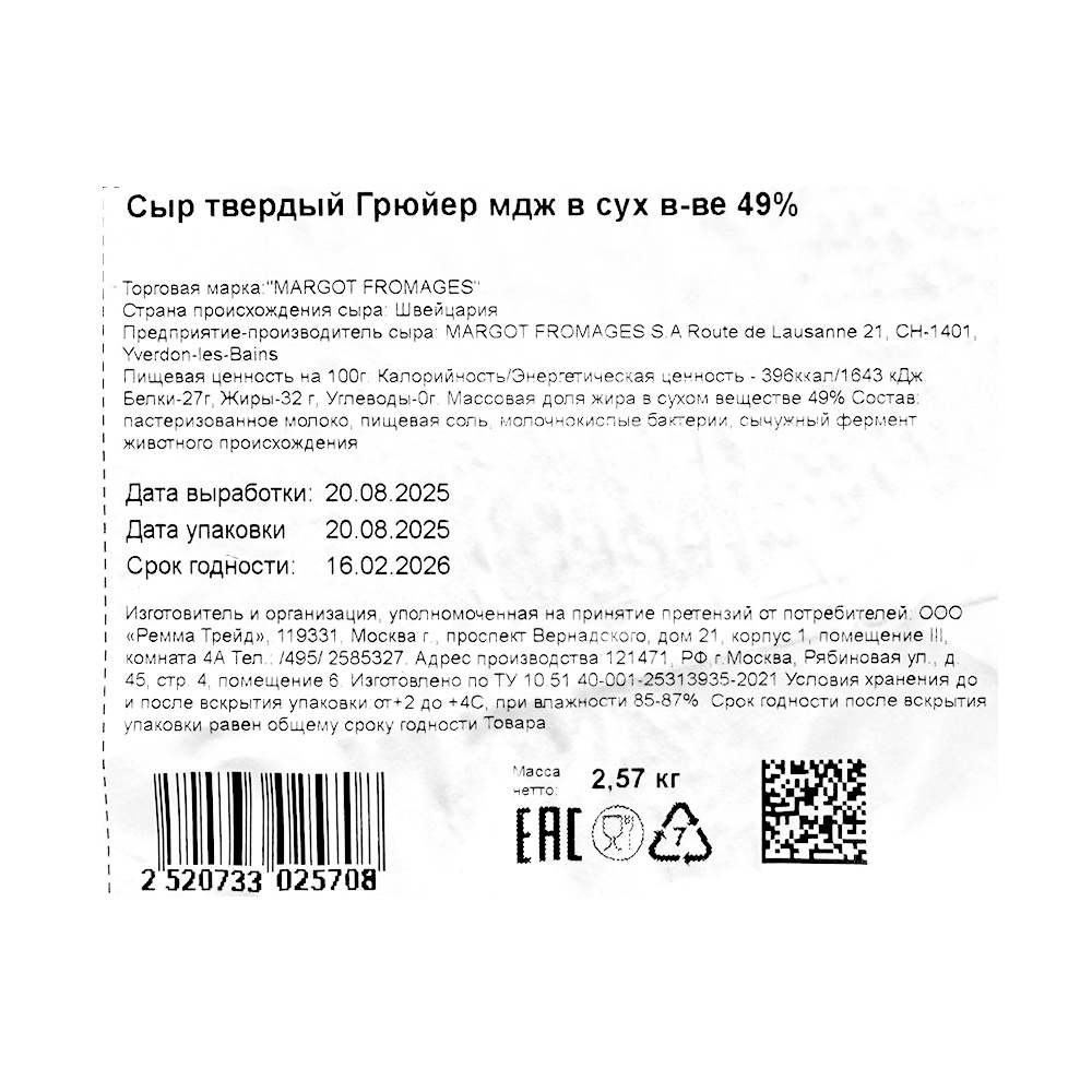Идеальный выбор для ценителей качественных сыров — изысканный Грюйер от Margot Fromages с выдержкой 12 месяцев. Этот сыр с насыщенным вкусом и ароматом станет отличным дополнением к сырной тарелке или ингредиентом для приготовления соусов, запеканок и других блюд. Прекрасно подойдёт для создания гастрономических шедевров.